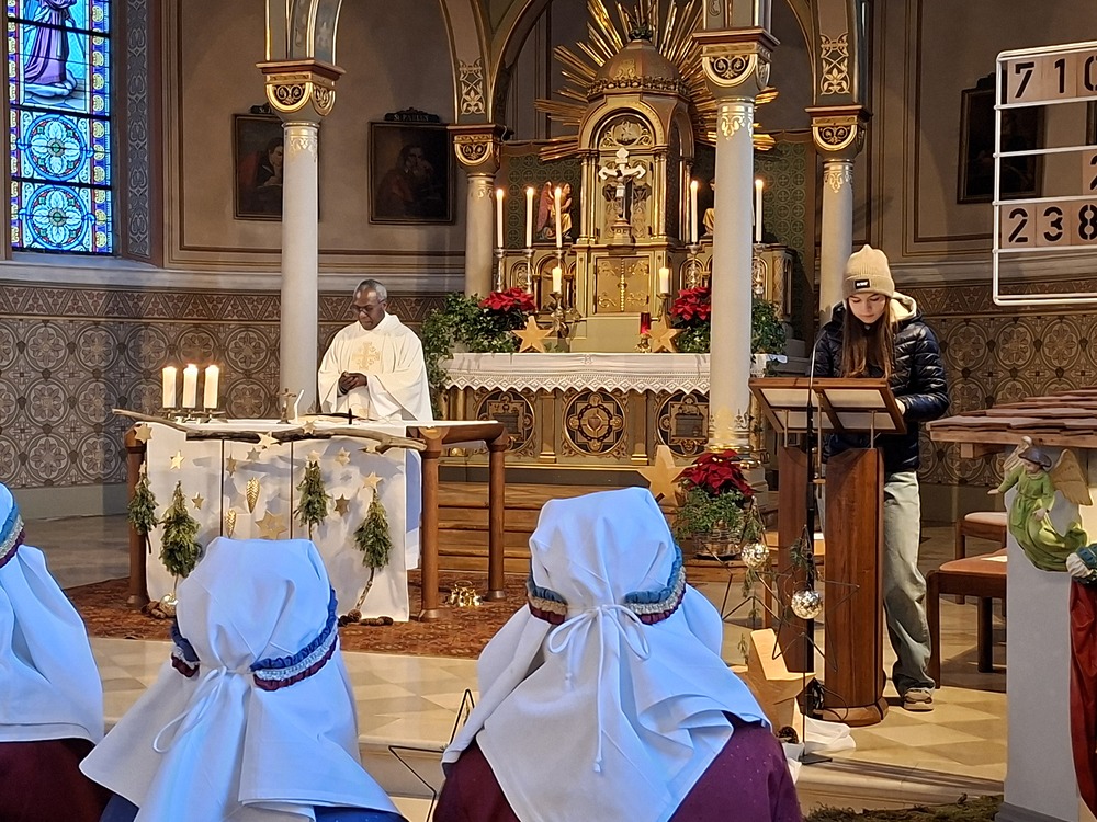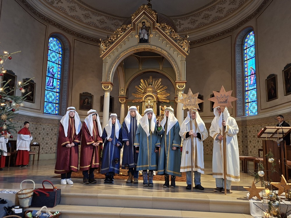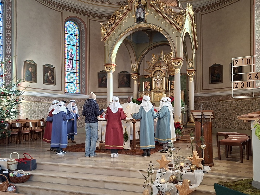 Zu Beginn des Gottesdienstes verkündeten die Sternsinger den Friedensgruß und richteten diesen an alle Gottesdienstteilnehmerinnen und -teilnehmer. Im weiteren Verlauf gestalteten sie die Heilige Messe maßgeblich mit. Besonders eindrucksvoll war das Zwiegespräch mit