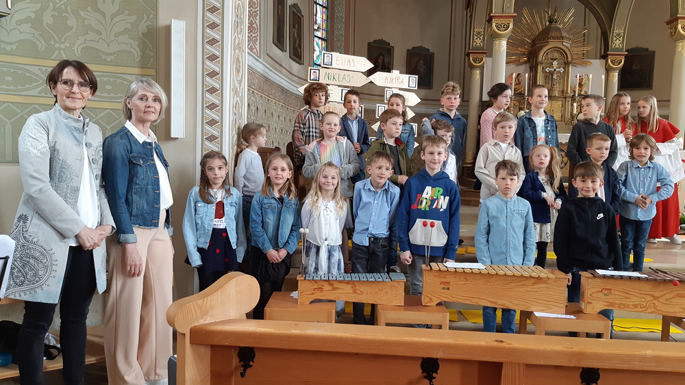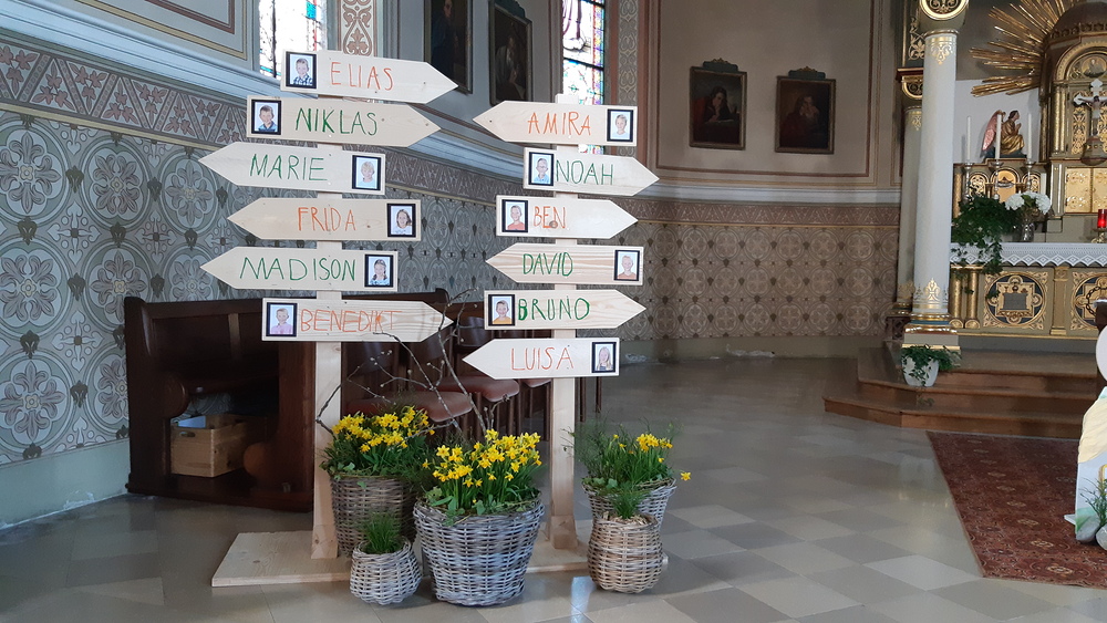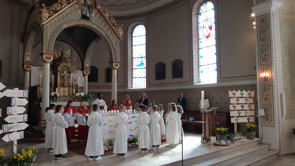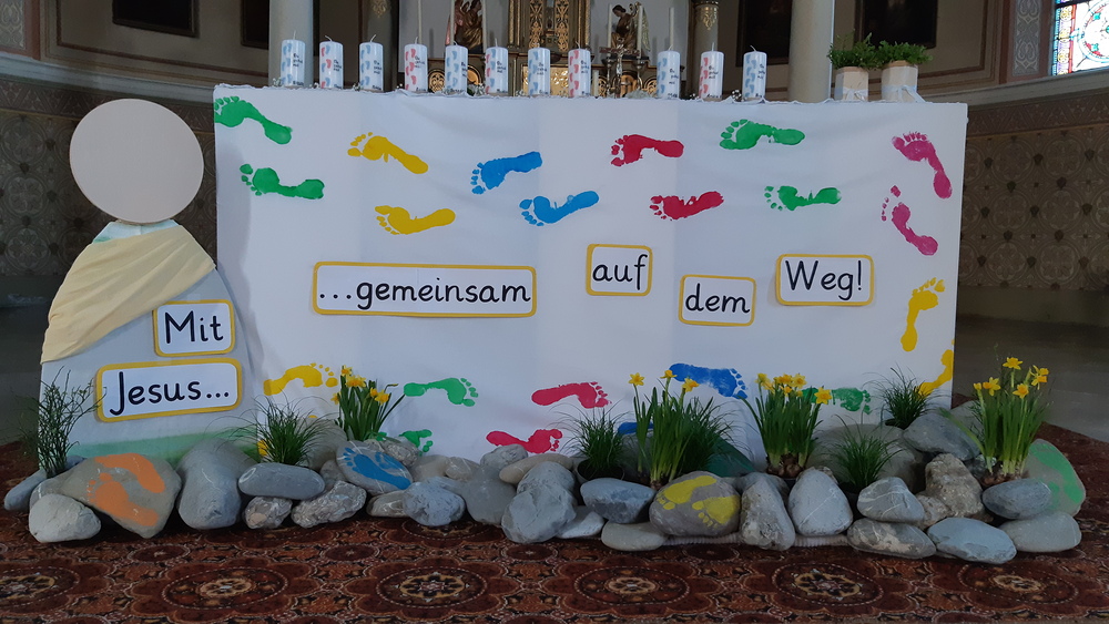 Mit dem Thema "Mit Jesus gemeinsam auf dem Weg" haben sich die Erstkommunikanten mit ihrer Religionslehrerin Annabell Österle bestens auf diesen Tag vorbereitet.