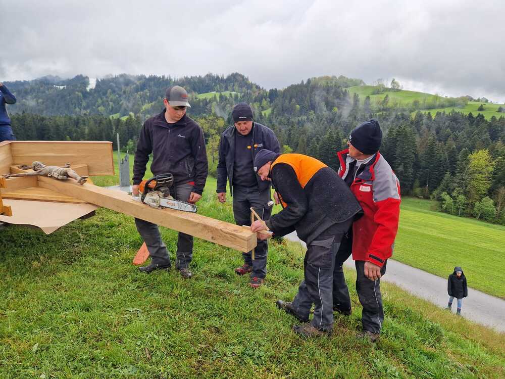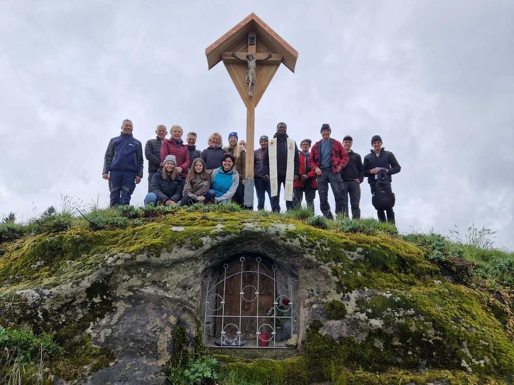 Die Einweihung fand am 20.04.2024 im kleinen Rahmen mit Pater Regis, Mesner Anton, den beteiligten Handwerkern und der Familie Maria und Günter Vögel statt, die das Kreuz errichten ließ.
