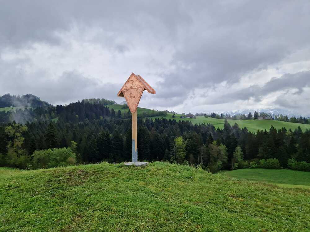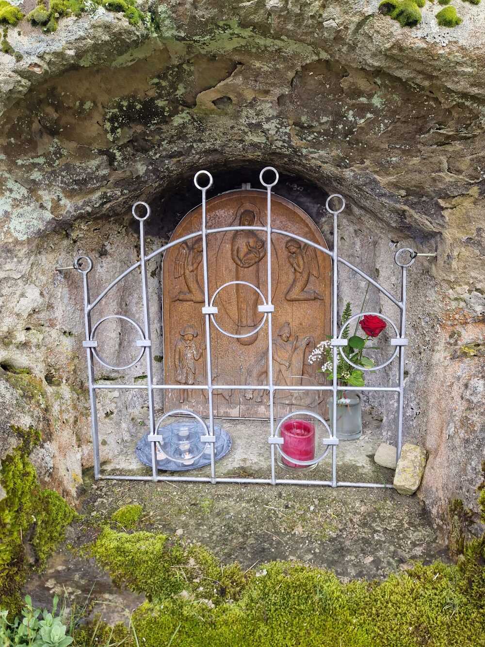 Das alte Kreuz fiel im August 2023 einer Windböe zum Opfer, wobei die geschnitzte Christusfigur gerettet werden konnte. Daraufhin wurde ein stabileres Fundament in den Sandsteinuntergrund betoniert und das Kreuz in der gleichen Form aus massivem Eichenholz und einem Satteldach aus Kupfer errichtet. In der darunterliegenden Grotte ist eine Holztafel aufgestellt, auf der unter anderem die Gottesmutter mit dem Kinde und der heilige Martin dargestellt ist.