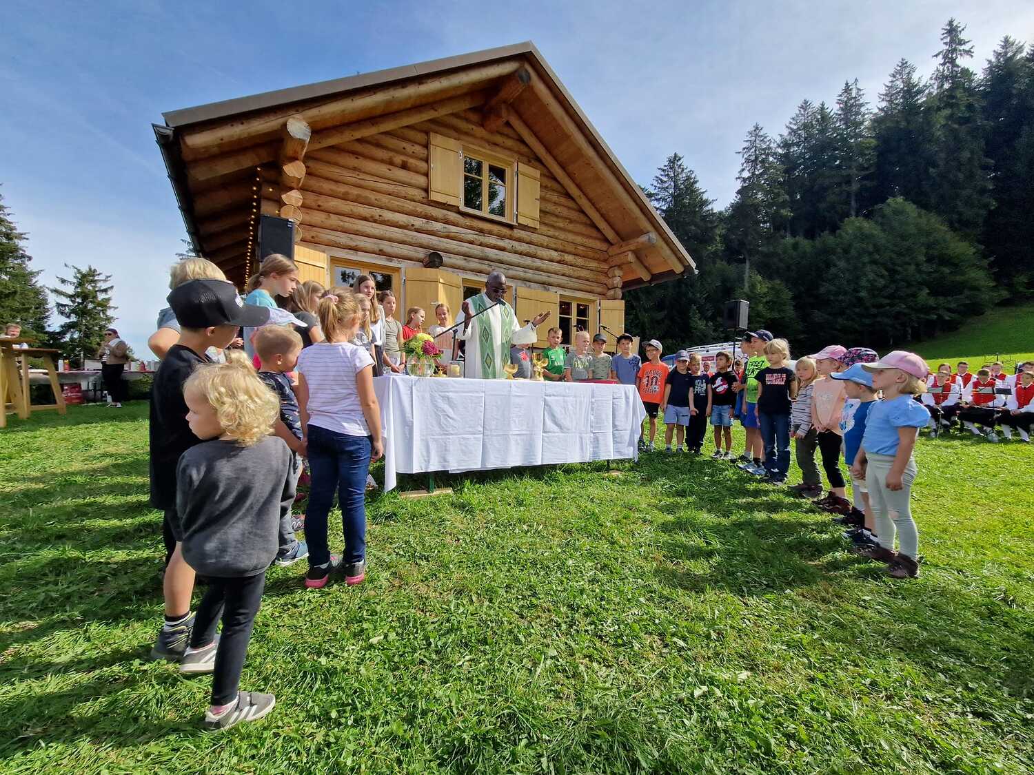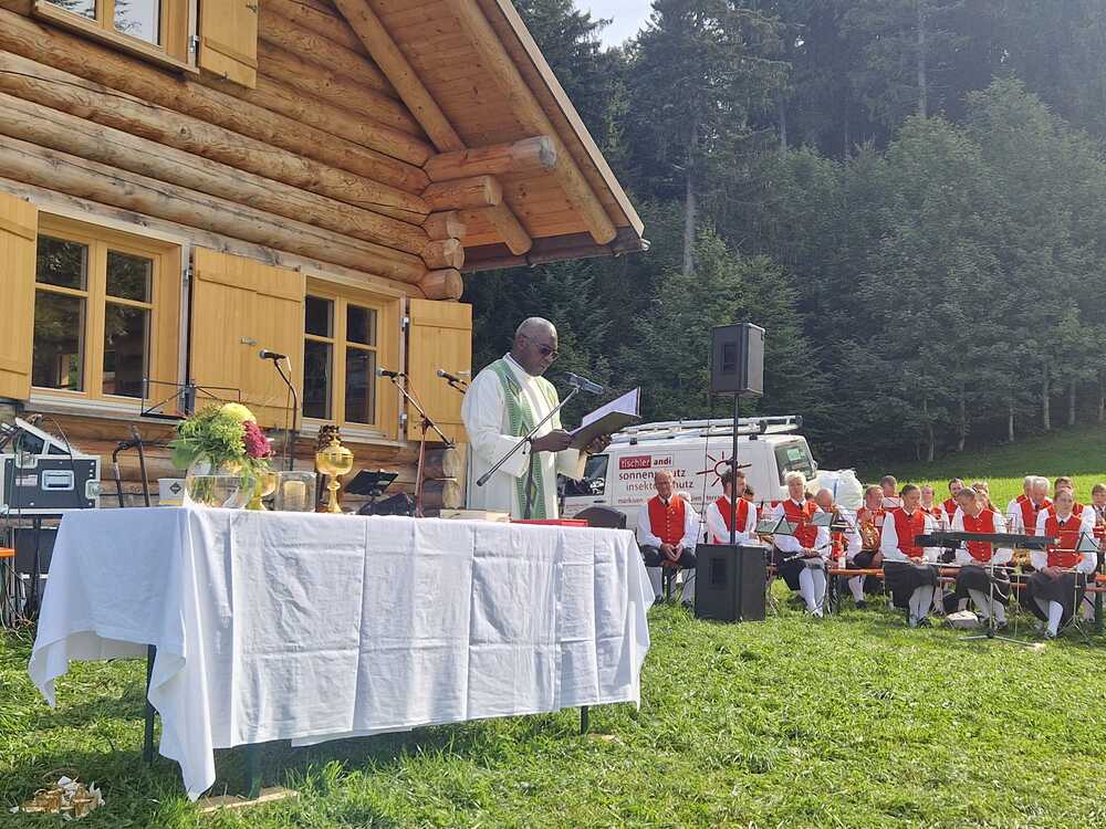 Pater Abidon feierte am 22.09.2024 seine erste Messfeier mit vielen Wanderern aus Doren und Umgebung vor der idyllischen Blockhütte am Schönengrund. Bei warmem Herbstwetter genossen die Gottesdienstbesucher im Anschluss die Klänge und die Bewirtung des Musikvereins.
