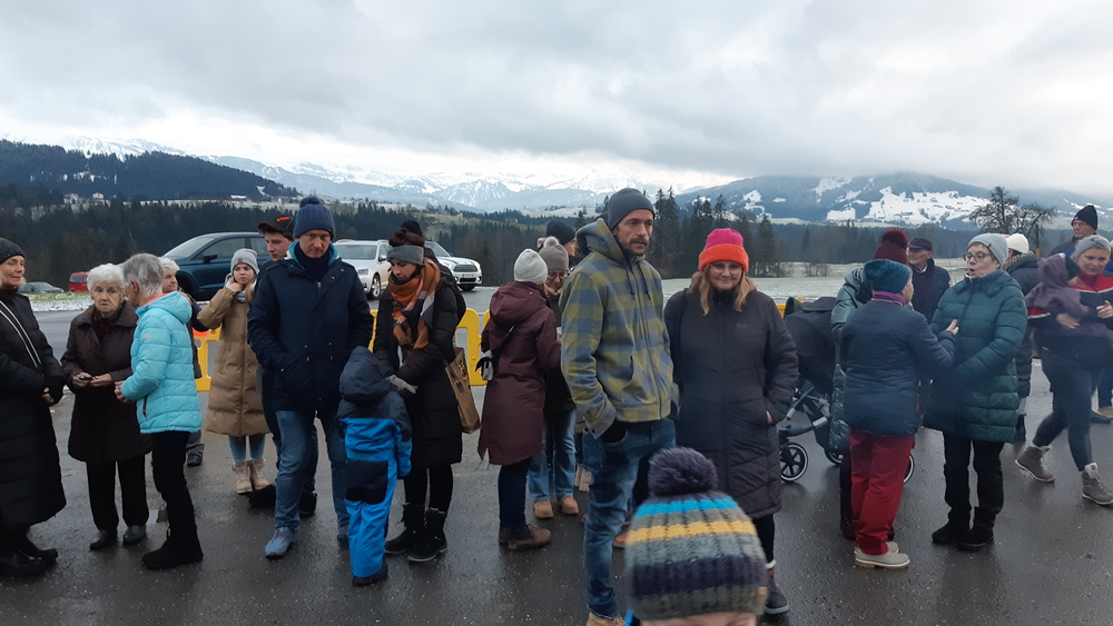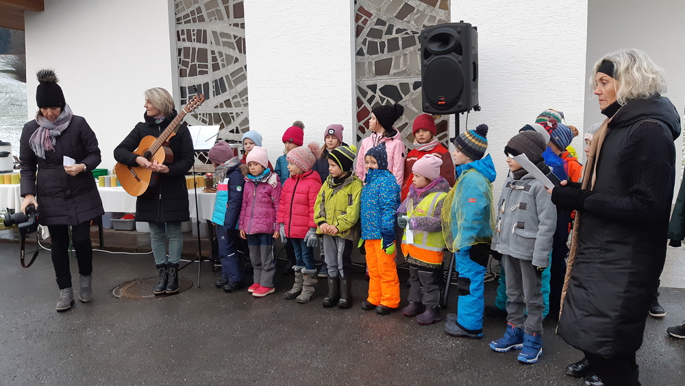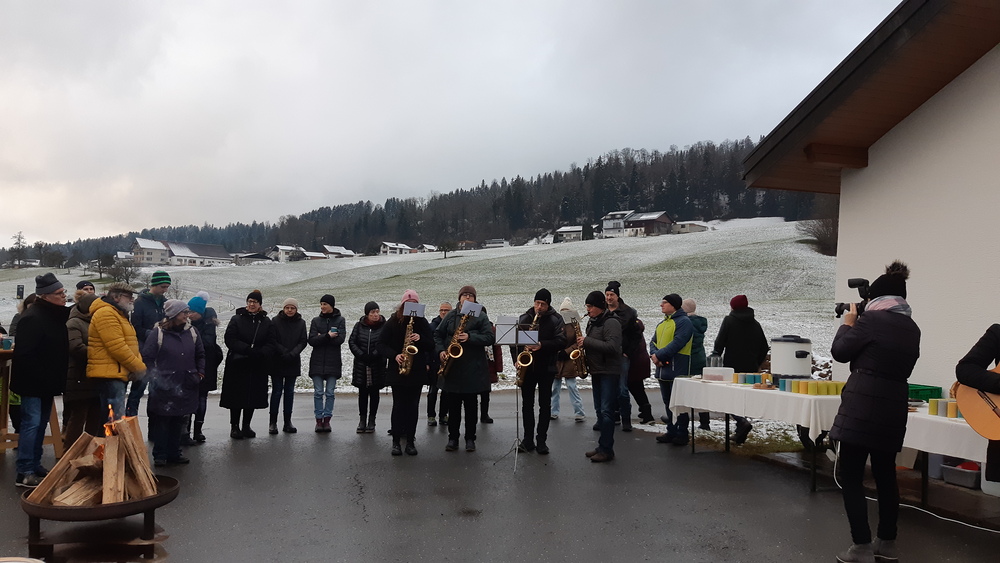 Am 3. Adventsonntag fand die Veranstaltung STERN*stund‘ bei der Kapelle Moos statt. Die Wiesen waren sanft mit einer weißen Schicht überzogen, während das Feuer in der Feuerschale knisterte und eine wohlige Wärme verströmte. In einer besinnlichen Atmosphäre wurde eine nachdenkliche Geschichte vorgetragen und Fürbitten zum Thema „Friede“ gesprochen. Musikalisch wurde der Nachmittag durch das Saxophonensemble des Musikvereins Doren sowie den Schulchor unter der Leitung von Sabine bereichert.