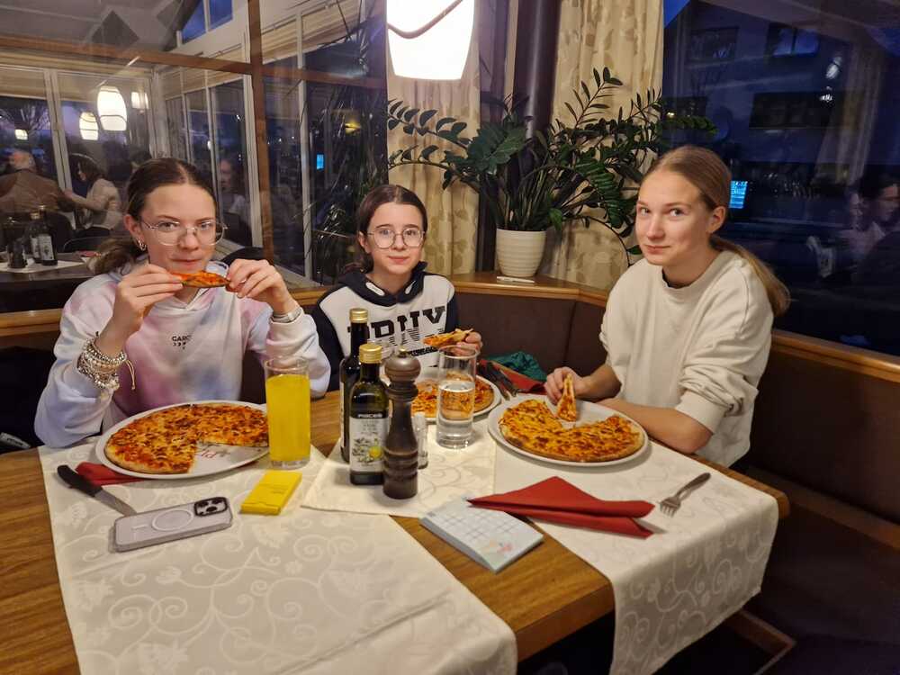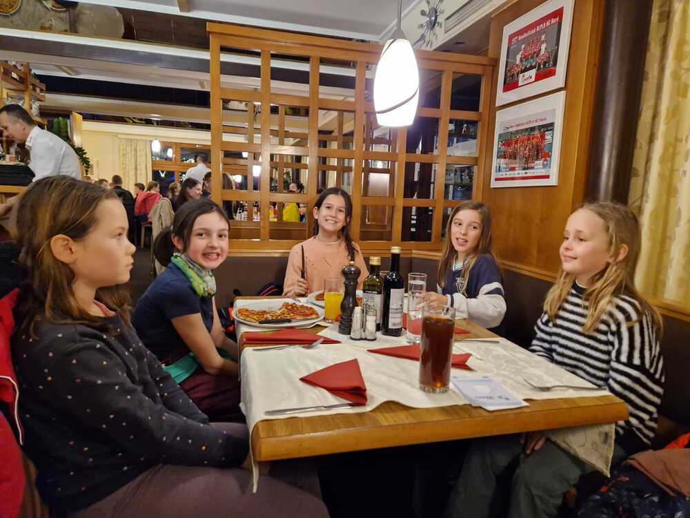Nach dem Eislaufen stärkten sich alle in einer nahegelegenen Pizzeria mit köstlicher Pizza und genossen die gemütliche Gemeinschaft. Am frühen Abend kehrte die Gruppe schließlich zufrieden und mit vielen schönen Erinnerungen nach Hause zurück. Der Ausflug war ein voller Erfolg und stärkte den Zusammenhalt unter den Ministranten.