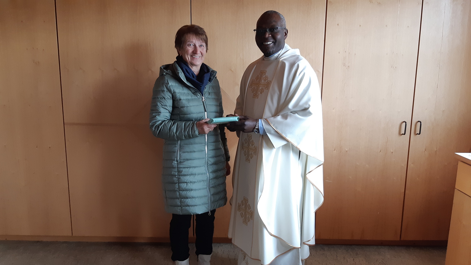 Das Weihnachtsrätsel aus dem Pfarrbrief fand seinen feierlichen Abschluss. Das Lösungswort "Frohbotschaft" führte zur Auslosung der glücklichen Gewinner am Schluss des Gottesdienstes. Pater Abidon übernahm nicht nur die Ziehung, sondern überreichte auch anschließend die Preise.