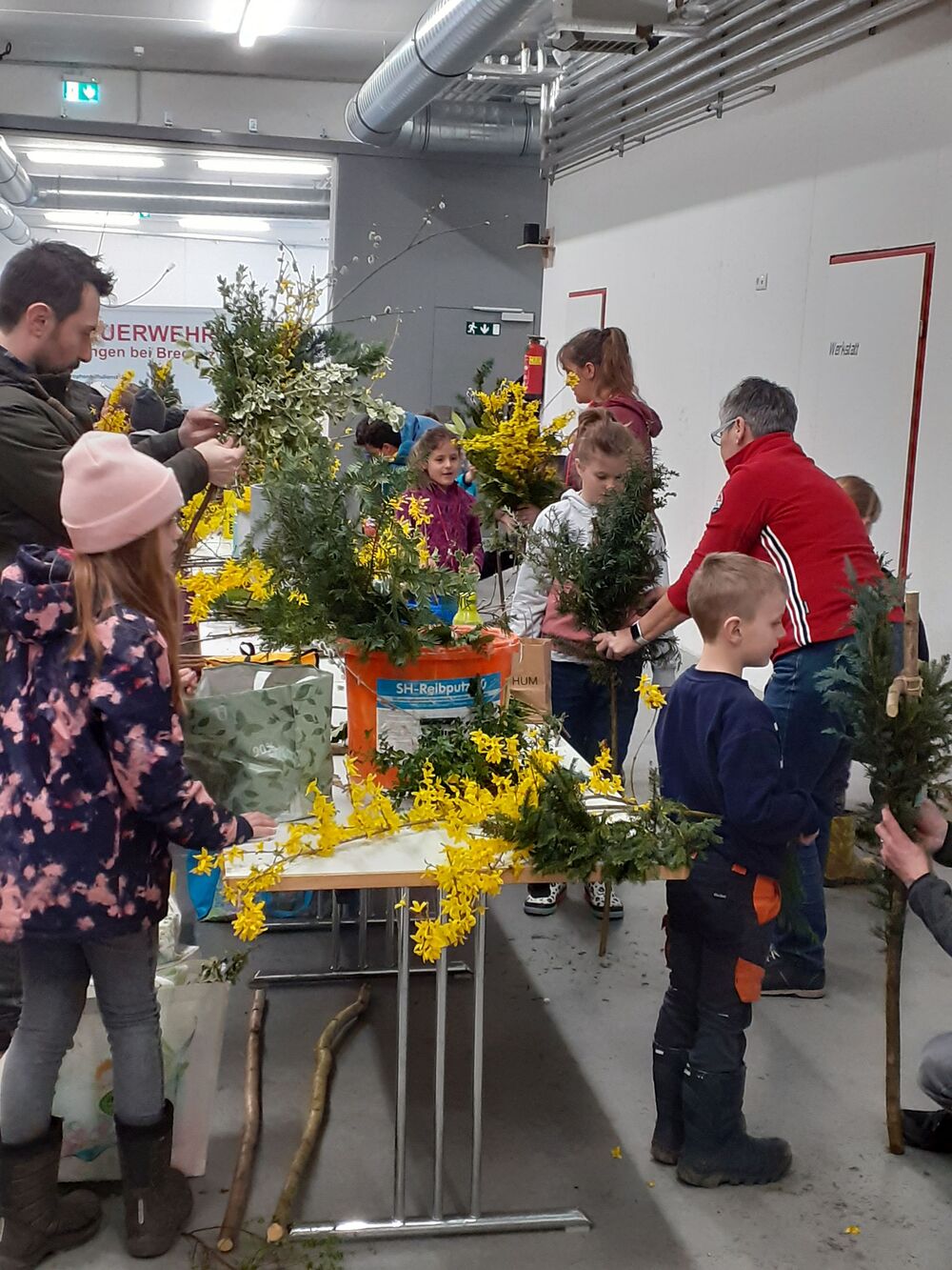 Am Samstag vor dem Palmsonntag trafen sich unsere Erstkommunionkinder mit ihren Papas, Patin oder Pate, zum traditionellen Palmbuschbinden, das aufgrund der schlechten und kalten Witterung dankenswerterweise in der Feuerwehrgarage stattfand.