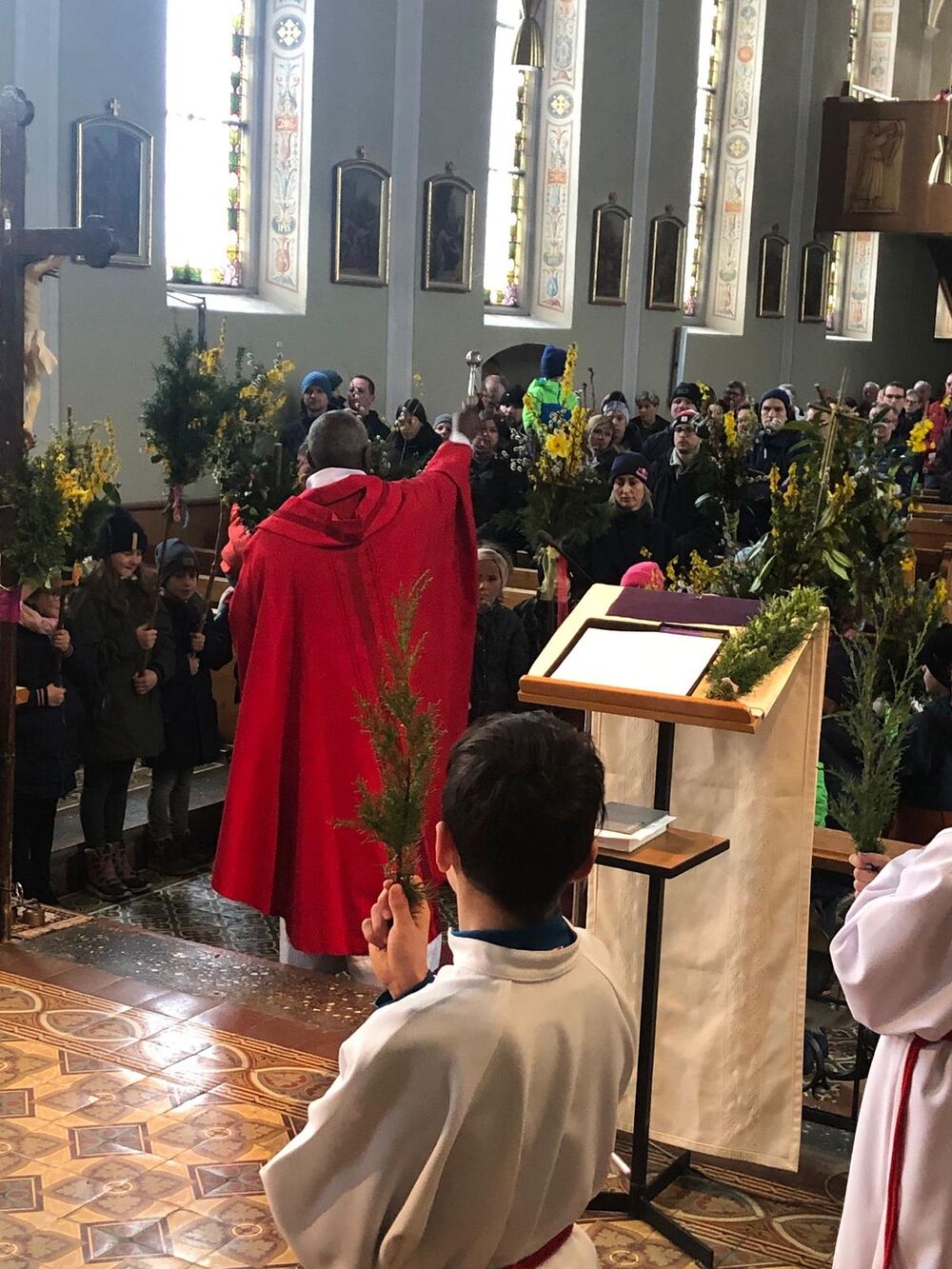 Die Palmweihe fand infolge des schlechten Wetters in der Kirche statt.