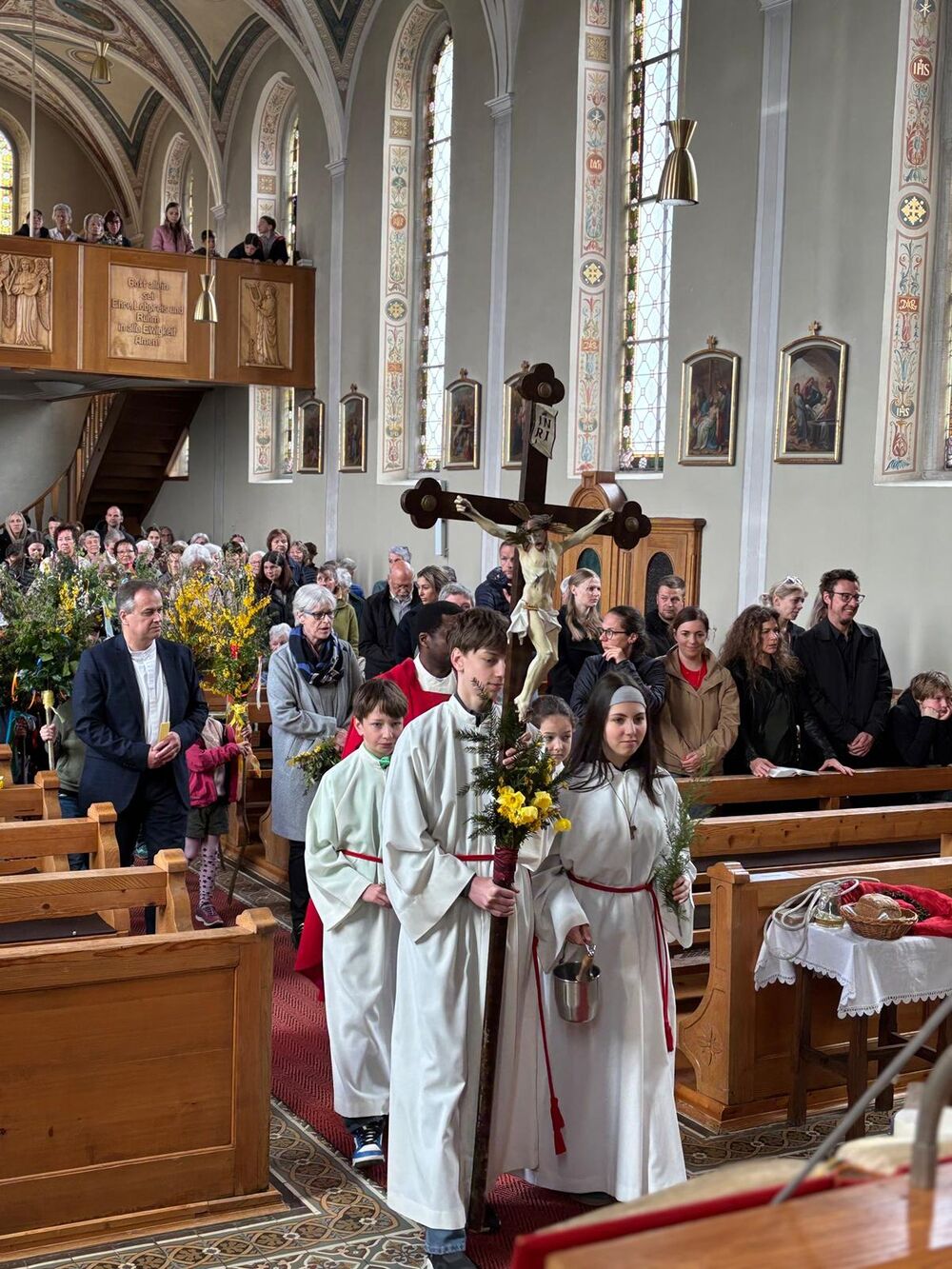 Am Samstag vor Palmsonntag trafen sich unsere Erstkommunionkinder mit ihren Vätern zum gemeinsamen Palmbuschbinden. Mit ihren Palmen zogen die Kinder am Palmsonntag feierlich in die Kirche ein, begrüßten Jesu und wirkten bei der Passion mit.