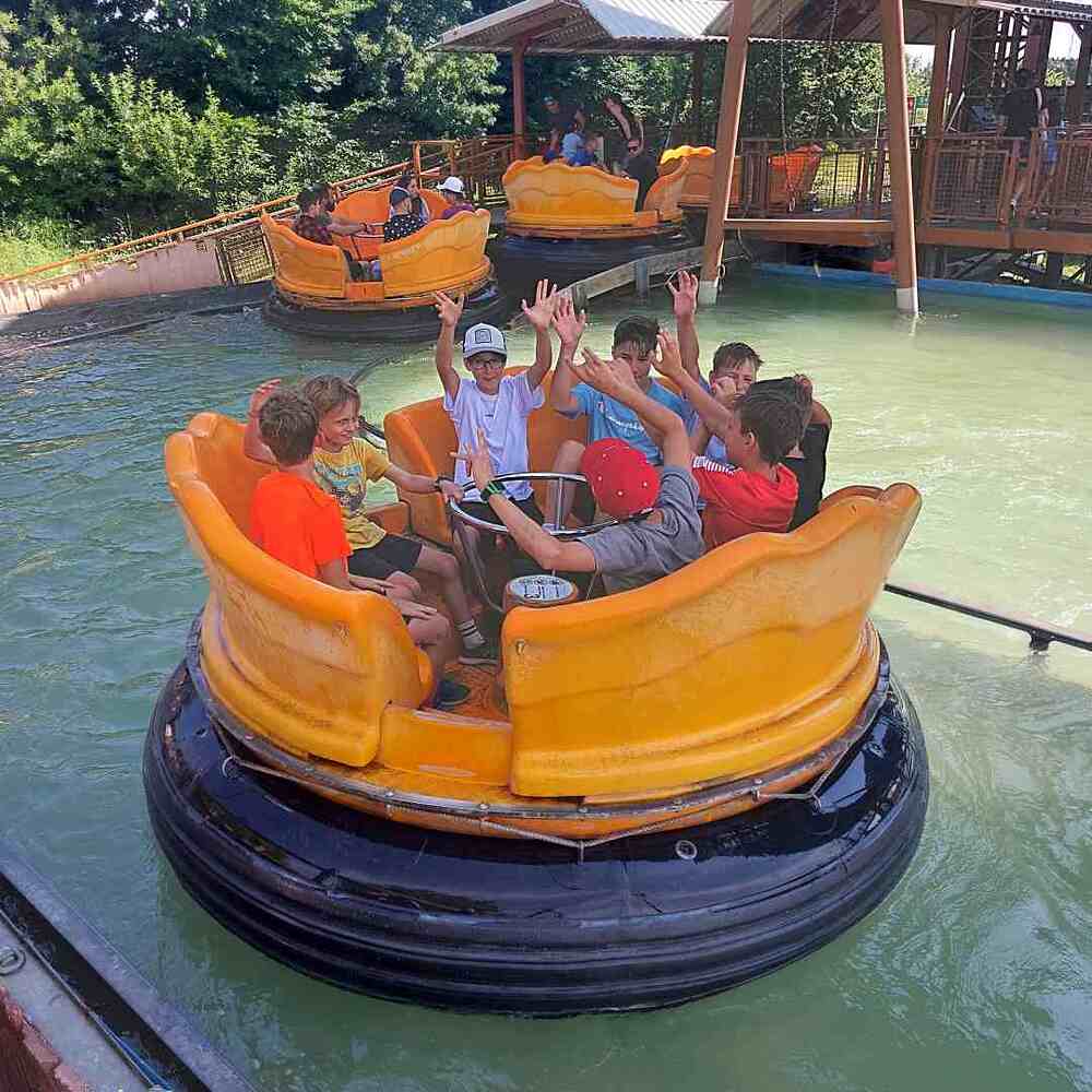 Pfarrer Hubert, 51 Ministranten und weitere Begleitpersonen des gesamten Pfarrverbandes verbrachten gemeinsam einen sonnigen Tag voller Spaß und Abendteuer im Skyline Park in Bad Wörishofen.