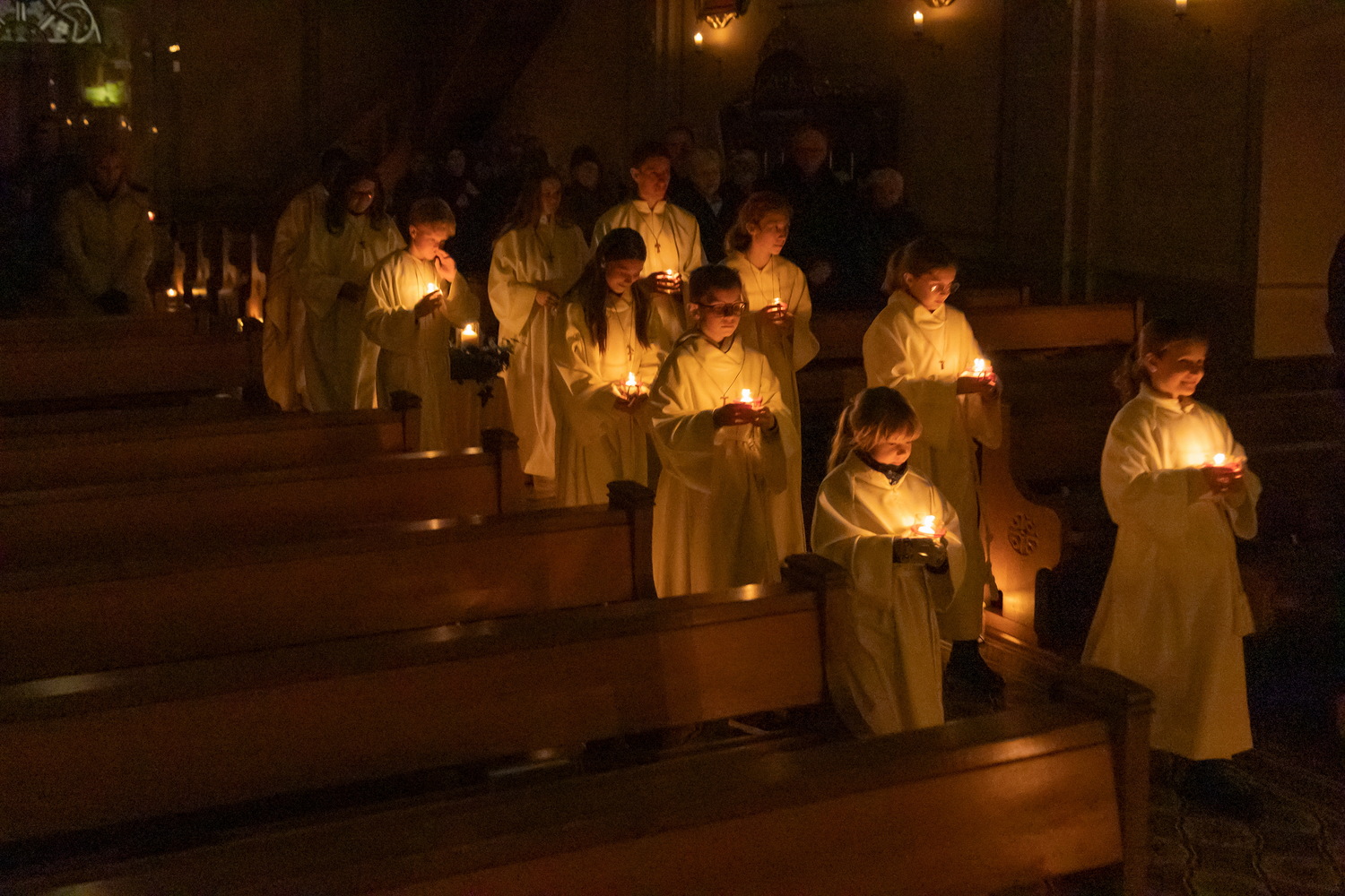Der Thaler Männerchor sorgte mit alten, gregorianischen Liedern für eine ganz besonders feierliche Stimmung. Der Kirchenraum erstrahlte im Kerzenschein und die zahlreichen Ministranten umrahmten diese schön gestaltete Messe.