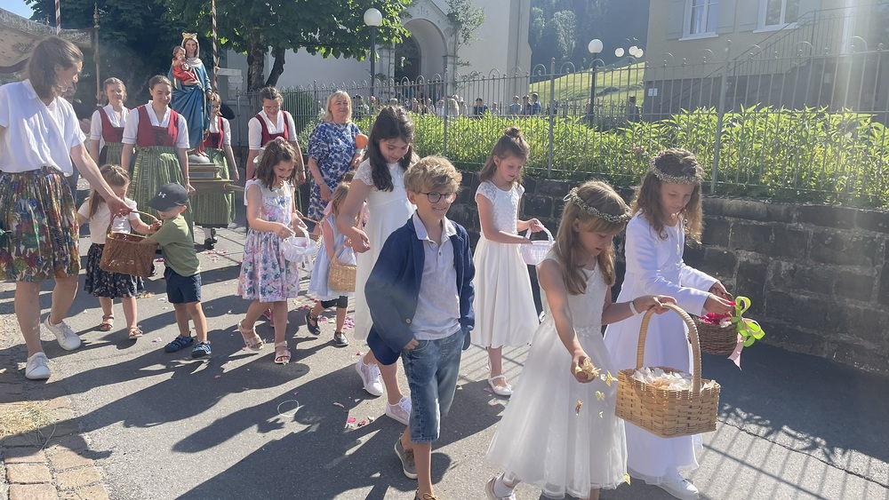Fronleichnam ist einer der wichtigsten und traditionsreichsten Feiertage in unserem Kirchenjahr. Dass dieser Tag ein ganz besonderer ist, zeigten auch die Fahnen an den Häusern und am Kirchturm.