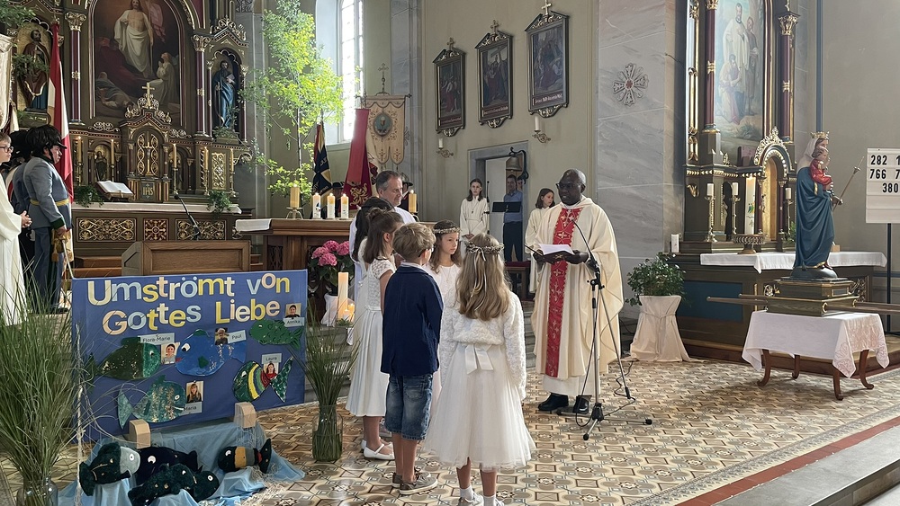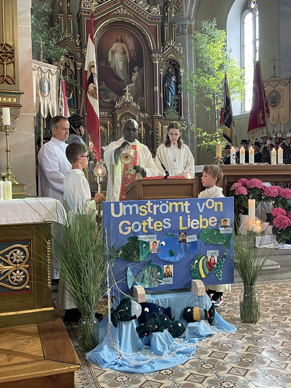 Zu Beginn begleiteten der Musikverein und die Fahnenabordnungen Pater Abidon mit den Ministranten und Erstkommunionkindern von der Krone zur Kirche, bevor alle feierlich in die Kirche einzogen.