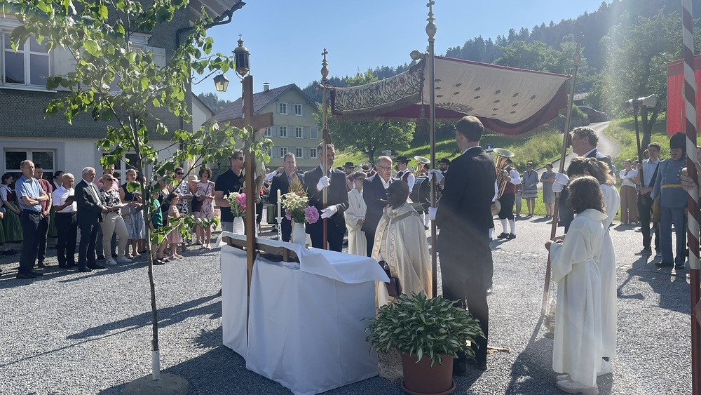 Bei bestem Sommerwetter zog die Prozession von Altar zu Altar, musikalisch umrahmt vom Musikverein und Kirchenchor.