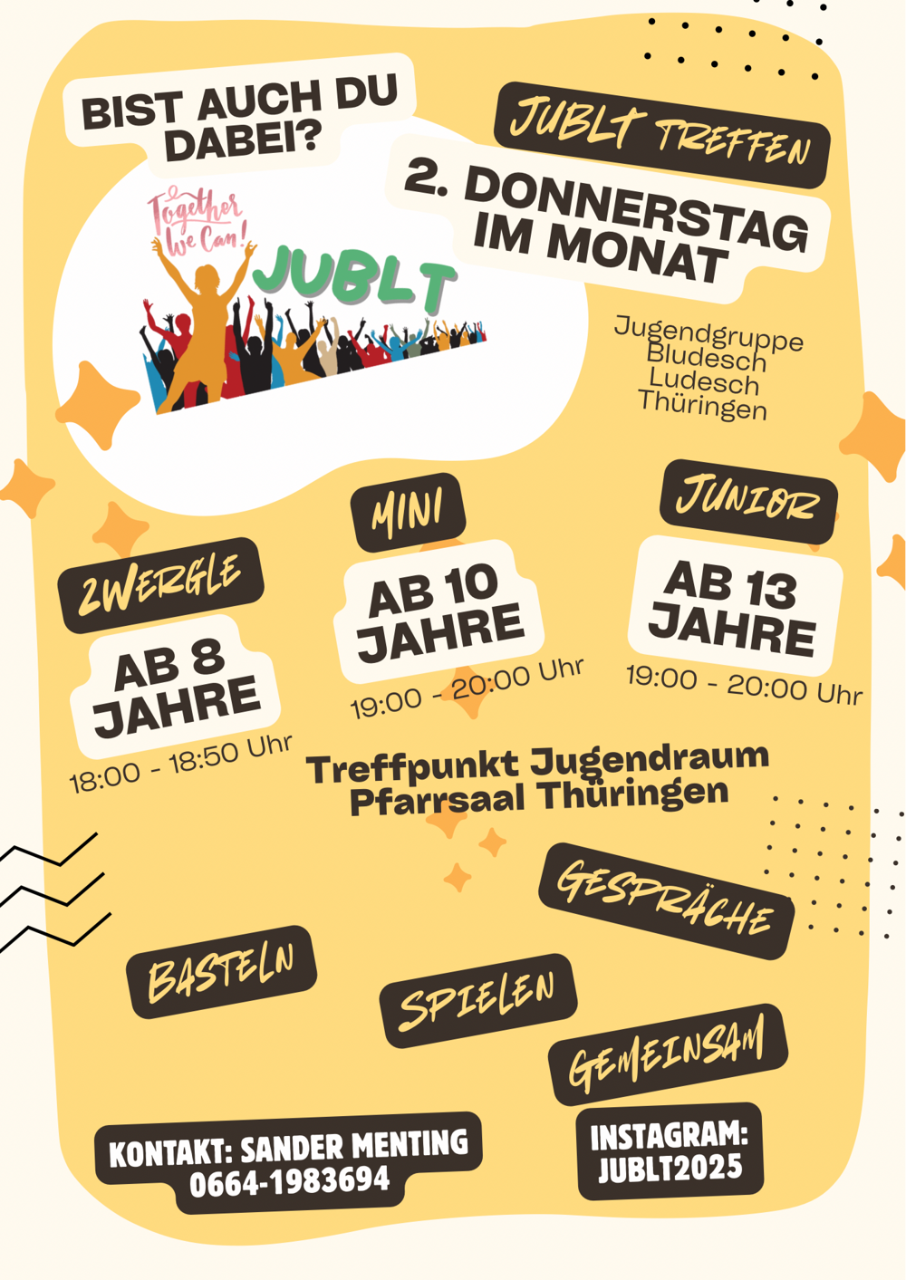 Die Pfarrgemeinden Bludesch, Ludesch und Thüringen organisieren für alle Kinder und Jugendlichen dieser Gemeinden verschiedene Aktivitäten. Unser Ziel ist es, durch engere Zusammenarbeit auch größere Aktionen umsetzen zu können.