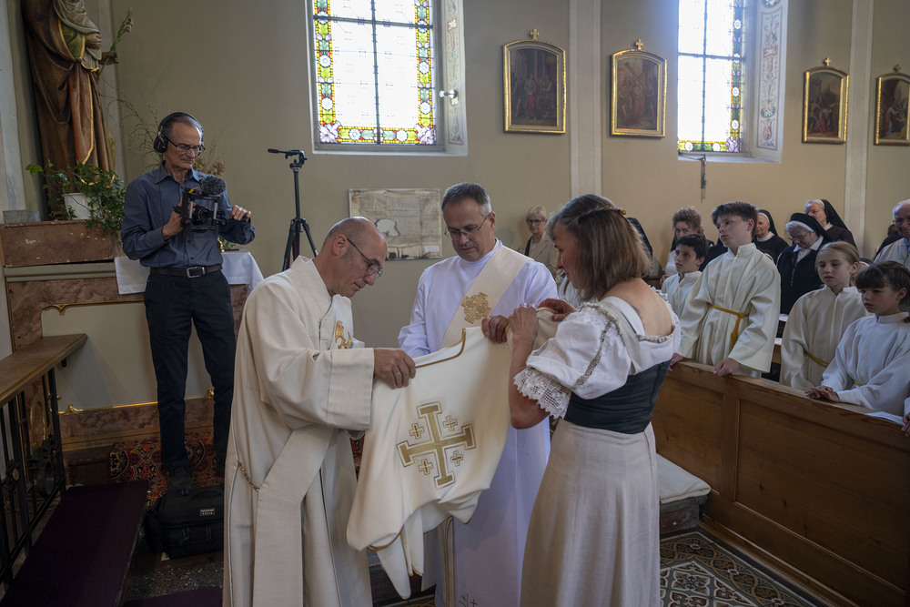 Während der Heiligenlitanei, die von Angela Knill gesungen wurde, lag Mario als Zeichen der Erfurcht und Hingabe am Boden. Danach halfen Marios Ehefrau Petra und Diakon Manfred Sutter beim Anlegen der Stola und Dalmatik.